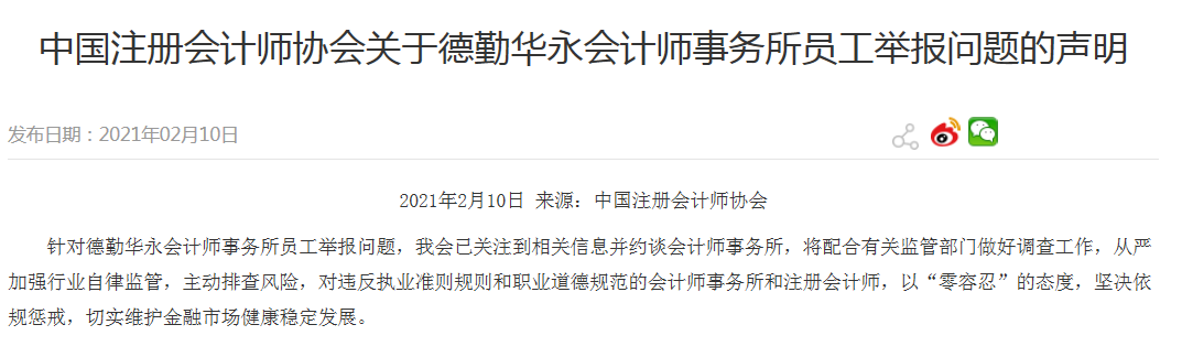 中国注册会计师协会在声明中称,针对德勤华永会计师事务所员工举报问题,我会已关注到相关信息并约谈会计师事务所,将配合有关监管部门做好调查工作,从严加强行业自律监管,主动排查风险,对违反执业准则规则和职业道德规范的会计师事务所和注册会计师,以“零容忍”的态度,坚决依规惩戒,切实维护金融市场健康稳定发展。