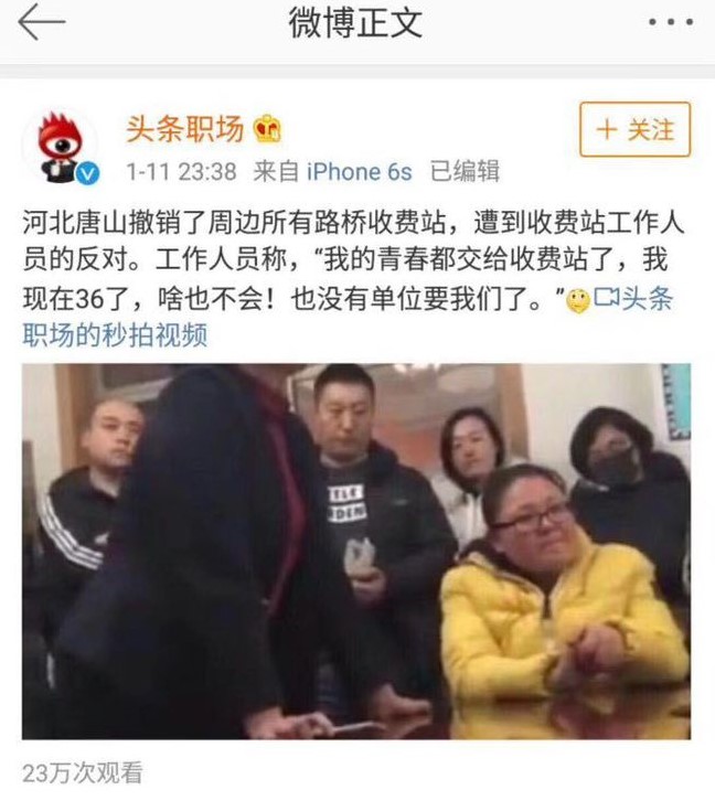 2018年初最火的一件事情就是唐山撤销了周边所有的收费站,因为收费站的存在已经影响到了周边的沟通往来。为了大局利益,肯定要进行裁撤,对于周边的县而言是一件大好事,但是对于这些收费人员而言,他们是集体反对的:我的青春都交给收费站了,我现在36了,啥也不会!也没有单位要我们了。